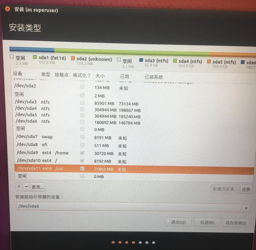 前面都是常规的安装流程,可以不连接 wifi,第三方库也不用安装,关键在分区部分,网上已经有大量关于 Ubuntu 分区的介绍和建议,因此这里给出我自己的分配仅做参考: