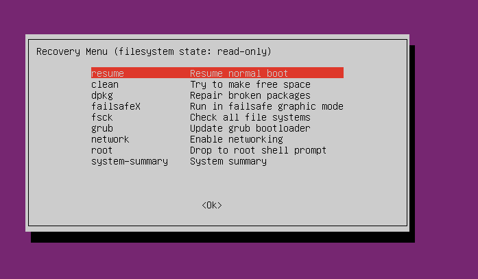 终于进系统了,不过这是 recovery mode,并且刚才的修改只是临时操作,重启后还是会出现相同的问题。