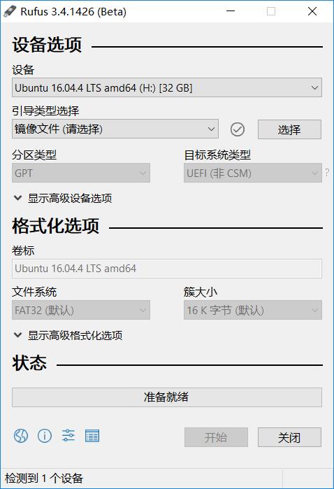 注:下图是我已经制作好了 U 盘启动盘后的 Rufus 界面截图,因此分区类型和目标系统类型是灰色的,开始按钮也是禁止状态,由此也可以看出,我制作的 U 盘是 GPT 分区类型,系统类型为 UEFI。