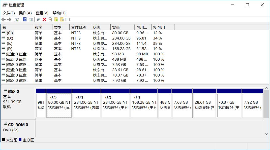 注:下图是我已经安装好了双系统之后回到 win 截的图,所以有很多盘并且没有分出来的空卷,你电脑上应该只有 C/D/E/F 这些盘,压缩出来的卷叫做“未分配”。